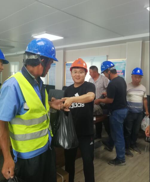 項(xiàng)目部提前策劃采購(gòu),為工友們精心準(zhǔn)備了粽子、綠豆、藿香正氣水等防暑降溫用品,并親手將這份清涼發(fā)放到工友代表們手中。工友們捧著手里的粽子以及防暑降溫用品高興地說(shuō):“感謝項(xiàng)目領(lǐng)導(dǎo)的關(guān)心,讓大家感受到了濃濃的節(jié)日氛圍,我們也將鼓足干勁,克服困難,把手里的工程干好?!痹诨顒?dòng)現(xiàn)場(chǎng),項(xiàng)目安全員也對(duì)高溫期間防暑降溫基本常識(shí)、施工作業(yè)注意事項(xiàng)等進(jìn)行了安全宣傳教育,切實(shí)提高工友們的高溫中暑安全預(yù)防意識(shí)和急救能力。